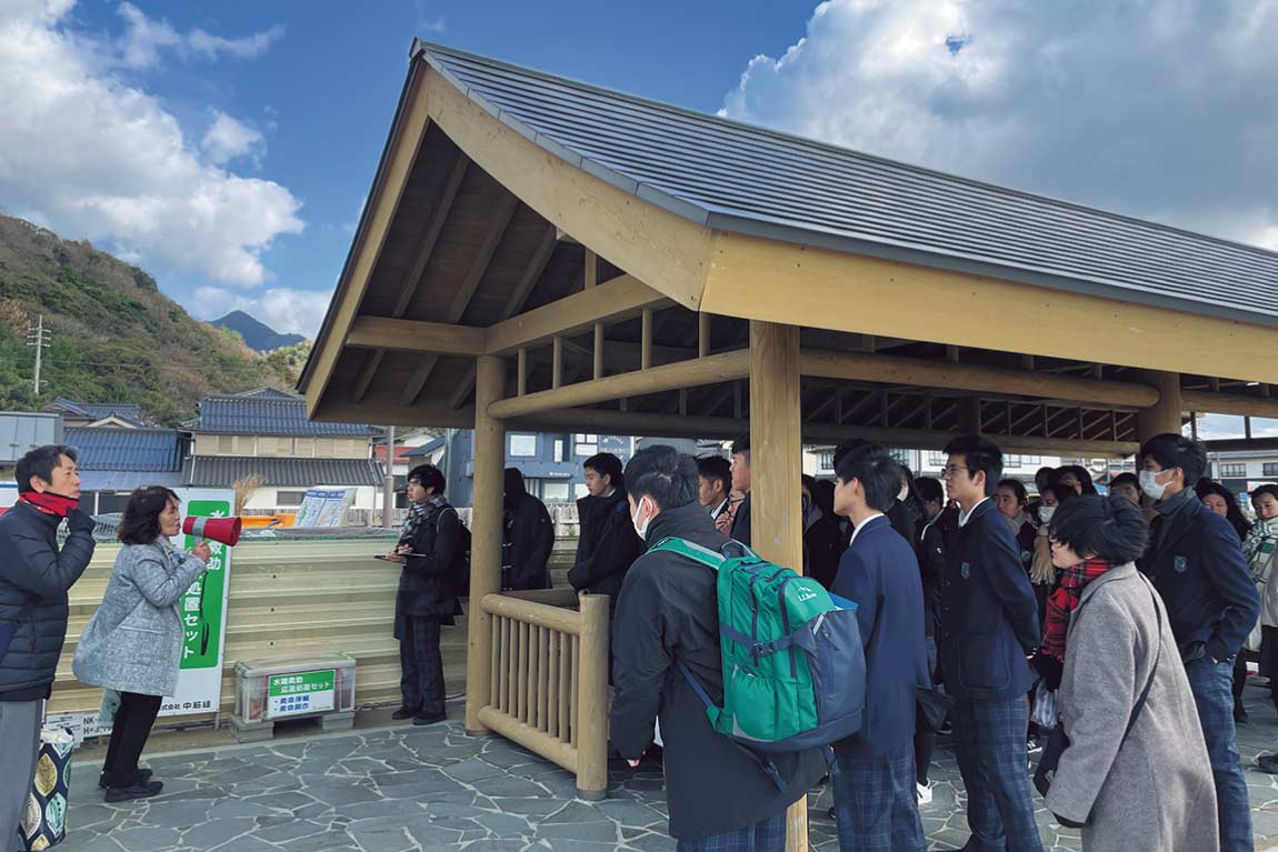 昨年12月に実施した出雲研修には、これまでで最も多くの生徒が参加。出雲大社や八重垣神社、風土記の丘資料館、女夫岩遺跡、神魂神社、荒神谷遺跡などの史跡や博物館を巡りながら見識を深めた。夜のミーティングでは、その日に聞いた話や感じたことなどを生徒同士で話し合い、共有することで、学びをさらに深めていった。